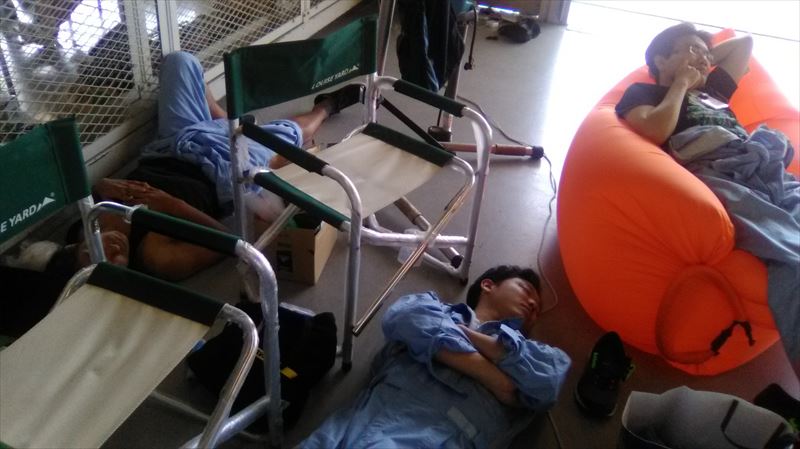 実は、ギリギリまで作業をしていたため、夜通し車を走らせてゼロ泊で鈴鹿サーキット入りであった。そして、すでに、メンバーはヘタってこんな状態。